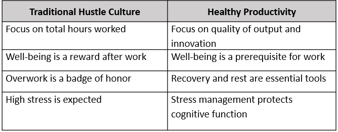 The conventional hustle culture suggests that success is achieved through relentless overwork. Yet, sociological research increasingly shows that these pressures trap individuals in a cycle of overwork and under-recovery, eroding both performance and well-being. Healthy productivity reframes the equation: personal well-being is not a reward after achievement; it is the foundation that makes achievement possible.