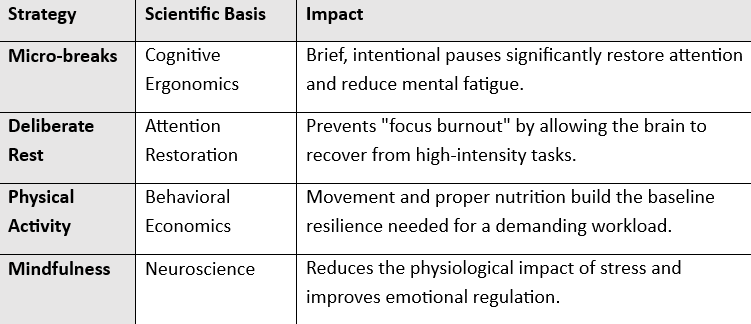 Building a sustainable pace requires proactive integration of health into your professional routine. Evidence from behavioral economics and cognitive psychology suggests several key strategies: